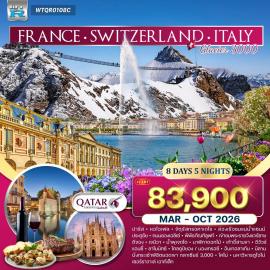 9 วัน 6 คืน | 8 ผู้เข้าชมทัวร์ยุโรป อิตาลี สวิส ฝรั่งเศส 9 วัน 6 คืน โรม - มอนเตคาตินี - ปิซ่า - เมสเตร้ - เวนิส - โคโม - ลูกาโน อินเทอร์ลาเค่น - เลาเทอร์บรุนเนน - กรินเดลวัลด์ - ดีจอง - ปารีส มองมาร์ต - นครรัฐวาติกัน - มหาวิหารเซนต์ปีเตอร์ - จัตุรัสเวเนเซีย ประตูชัยคอนสแตนติน - โคลอสเซียม - น้ำพุเทรวี่ - บันไดสเปน หอเอนเมืองปิซ่า - ล่องเรือเกาะเวนิส - โบสถ์เซนต์มาร์ก - จัตุรัสซานมาร์โค ล่องเรือกอนโดลา - เมืองโคโม - ทะเลสาบลูกาโน - เมืองอินเทอร์ลาเค่น นาฬิกาดอกไม้ - หมู่บ้านเลาเทอร์บรุนเนน - น้ำตกสเตาบ์บาค รถไฟฟันเฟืองขึ้นยอดเขาจุงเฟรา (Top of Europe) - ถ้ำน้ำแข็ง Ice Palace ธารน้ำแข็ง Aletsch (UNESCO) - กระเช้า V Cableway สู่ กรินเดลวัลด์ เมืองดีจอง (อดีตเมืองหลวงแคว้นเบอร์กันดี) - พระราชวังแวร์ซายส์ ล่องเรือแม่น้ำแซนน์ ชมหอไอเฟล พิพิธภัณฑ์ลูฟร์ และโบสถ์นอร์ทเทรอดาม จัตุรัสคองคอร์ด - ถนนชองเอลิเซ่ - หอไอเฟล - ประตูชัยนโปเลียน La Vallee Shopping Outlet เมนูพิเศษ!! ดินเนอร์พาสต้าอิตาเลียนแท้ พร้อมของหวาน ดินเนอร์บนยอดเขาจุงเฟรา (วิว Panorama Restaurant) ดินเนอร์หอยเอสคาโก้ พร้อมไวน์แดงฝรั่งเศส พักโรงแรมระดับ 4 ดาว โดยสายการบินกาต้าร์ แอร์เวย์ QATAR AIRWAYSTHB 95,900.-เฉลี่ย / คน| CODE : WTQR0109F