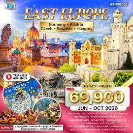 8 วัน 5 คืน | 7 ผู้เข้าชมทัวร์ยุโรปตะวันออก 8 วัน 5 คืน เยอรมัน - เช็ก - ออสเตรีย - ฮังการี มิวนิค - ฟุสเซ่น - โรเซนไฮม์ - ฮัลล์สตัทท์ - เชสกี้ คลุมลอฟ เชสกี้ บูโดโยวิซ - ปร๊าก -เบอร์โน่ - เวียนนา - บราติสลาวา - บูดาเปสต์ ปราสาทนอยชวานสไตน์ - สะพานมาเรียนบรูค - หมู่บ้านฮัลล์สตัทท์ ปราสาทครุมลอฟ - ปราสาทปร๊าก - มหาวิหารเซนต์วิตัส - กำแพงเลนนอน สะพานชาร์ลส์ - จัตุรัสเมืองเก่า - หอนาฬิกาดาราศาสตร์ พระราชวังเชินบรุนน์ - อนุสาวรีย์โยฮันสเตร้าส์ - โบสถ์เซนต์สตีเฟน สวนสาธารณะสตัดปาร์ค - ประตูไมเคิล - รูปปั้นคนตกท่อคูมิล รูปปั้นนโปเลียน - เมืองเก่าบราติสลาวา - Outlet Parndorf ฮีโร่สแควร์ - ล่องเรือแม่น้ำดานูบ - อาคารรัฐสภาฮังการี ป้อมฟิชเชอร์แมนบาสเตียน - คาสเซิ่ลฮิลล์ เมนูพิเศษ!! ขาหมูเยอรมัน, ปลาเทราท์ฮัลล์สตัทท์ ซี่โครงหมูเวียนนา, ซุปกูลาสฮังกาเรียน พักโรงแรมระดับ 4 ดาว โดยสายการบินเตอร์กิช แอร์ไลน์ TURKISH AIRLINESTHB 69,900.-เฉลี่ย / คน| CODE : WTTK0208B