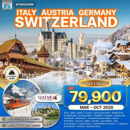 8 วัน 5 คืน | 2 ผู้เข้าชมทัวร์ยุโรปโรแมนติก 8 วัน 5 คืน อิตาลี - ออสเตรีย - เยอรมัน - สวิส (จุงเฟรา) มิลาน - เวนิส - เมสเตร้ - ฮัลล์สตัทท์ - ซาลส์บูร์ก - อินน์สบรูกซ์ เคมเทน - วาดุส - ลูเซิร์น - เลาเทอร์บรุนเนน - อินเทอร์ลาเก้น ซูริค - มหาวิหารดูโอโม มิลาน - จัตุรัสซานมาร์โค - โบสถ์เซนต์มาร์ก ล่องเรือกอนโดล่า - หมู่บ้านฮัลล์สตัทท์ - สวนมิราเบลล์ - บ้านโมสาร์ท ถนนมาเรียเทเรซ่า - หลังคาทองคำ - ปราสาทนอยชวานสไตน์ กรุงวาดุส - สะพานไม้คาเปล - อนุสาวรีย์สิงโต - ย่านเมืองเก่าลูเซิร์น ยอดเขาจุงเฟรา - ถ้ำน้ำแข็ง 1,000 ปี - น้ำตกชเตาบ์บาค กระเช้า V-Cableway - เมืองอินเทอร์ลาเก้น - น้ำตกไรน์ - ถนนลิมแมทคีย์ เมนูพิเศษ!! ดินเนอร์ซีฟู้ดอิตาเลียน, ขาหมูเยอรมัน, ฟองดูชีสสวิส ดินเนอร์บนยอดเขาจุงเฟรา, ดินเนอร์ฉลองปีใหม่ในซูริค พักโรงแรมระดับ 4 ดาว โดยสายการบินกาต้าร์ แอร์เวย์ QATAR AIRWAYSTHB 95,900.-เฉลี่ย / คน| CODE : WTQR0308NY